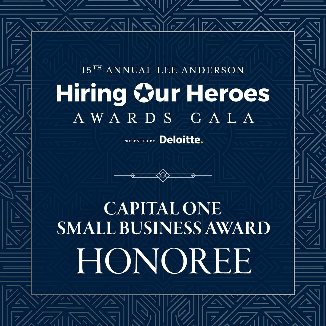 The Capital One Small Business Award, presented annually at the Hiring Our Heroes Lee Anderson Awards Gala, honors a veteran- or military spouse-owned small business that demonstrates exceptional commitment to the military community. We will be receiving this award at this year’s gala in Washington, D.C. on November 5.